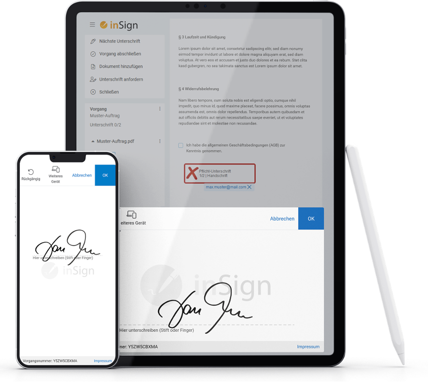 Подписването с решението inSign е много лесно. Можете да използвате смартфон или таблет, накратко всяко сензорно устройство. Това е удобна форма за електронно подписване за финансови консултанти, брокери, но също така и за банки, продавачи на комунални услуги и всъщност всички, които подписват всякакви документи със своите партньори или клиенти в своята бизнес практика.